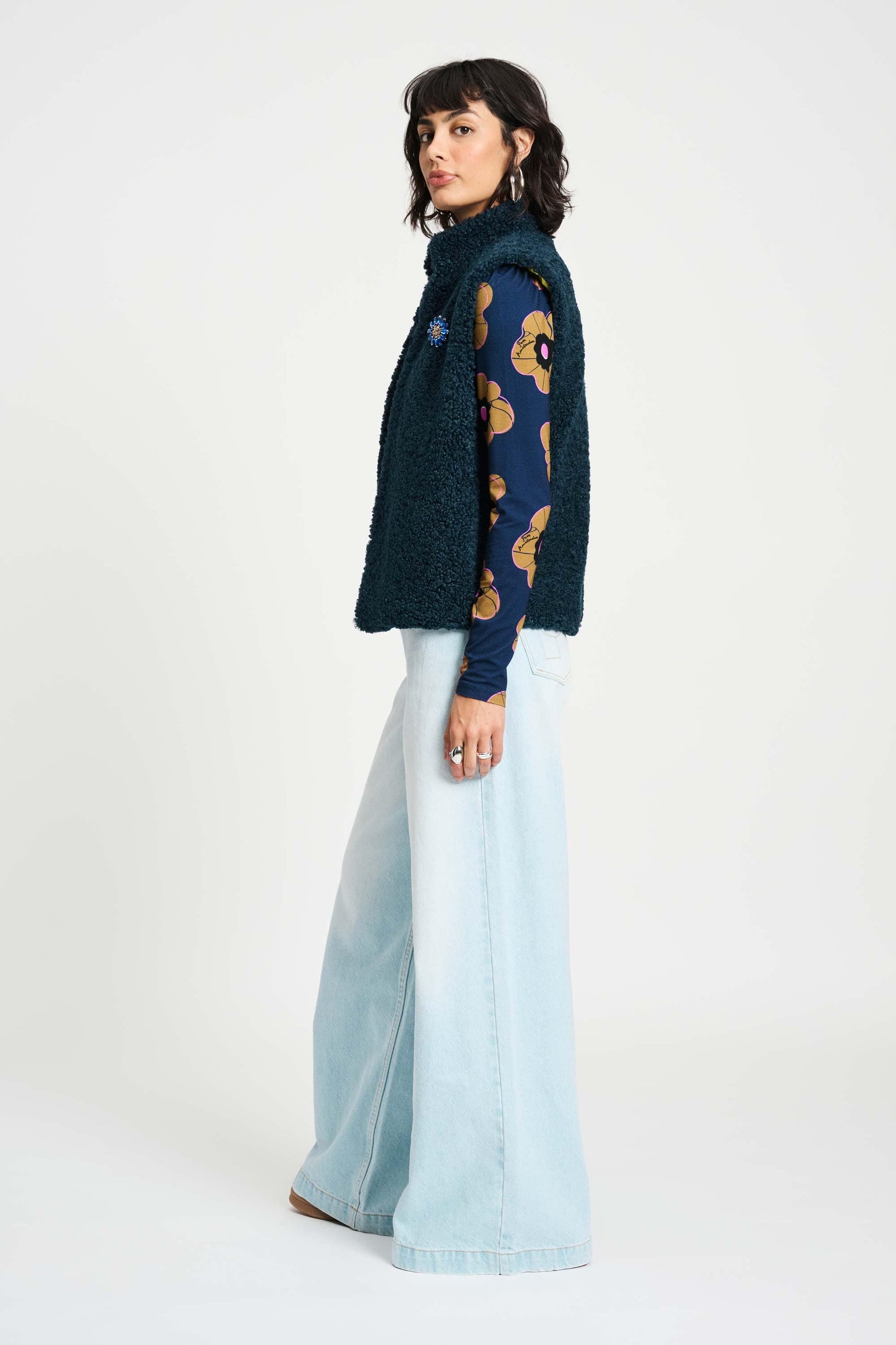 Le gilet a une coupe droite et arrive à la hanche. Le mannequin sur la photo mesure 175 cm et porte une taille 36.