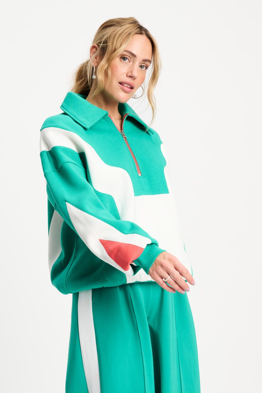 Coupe : Le sweat présente une coupe ample et boxy avec des manches longues. Le mannequin sur la photo mesure 170 cm et porte une taille 36.