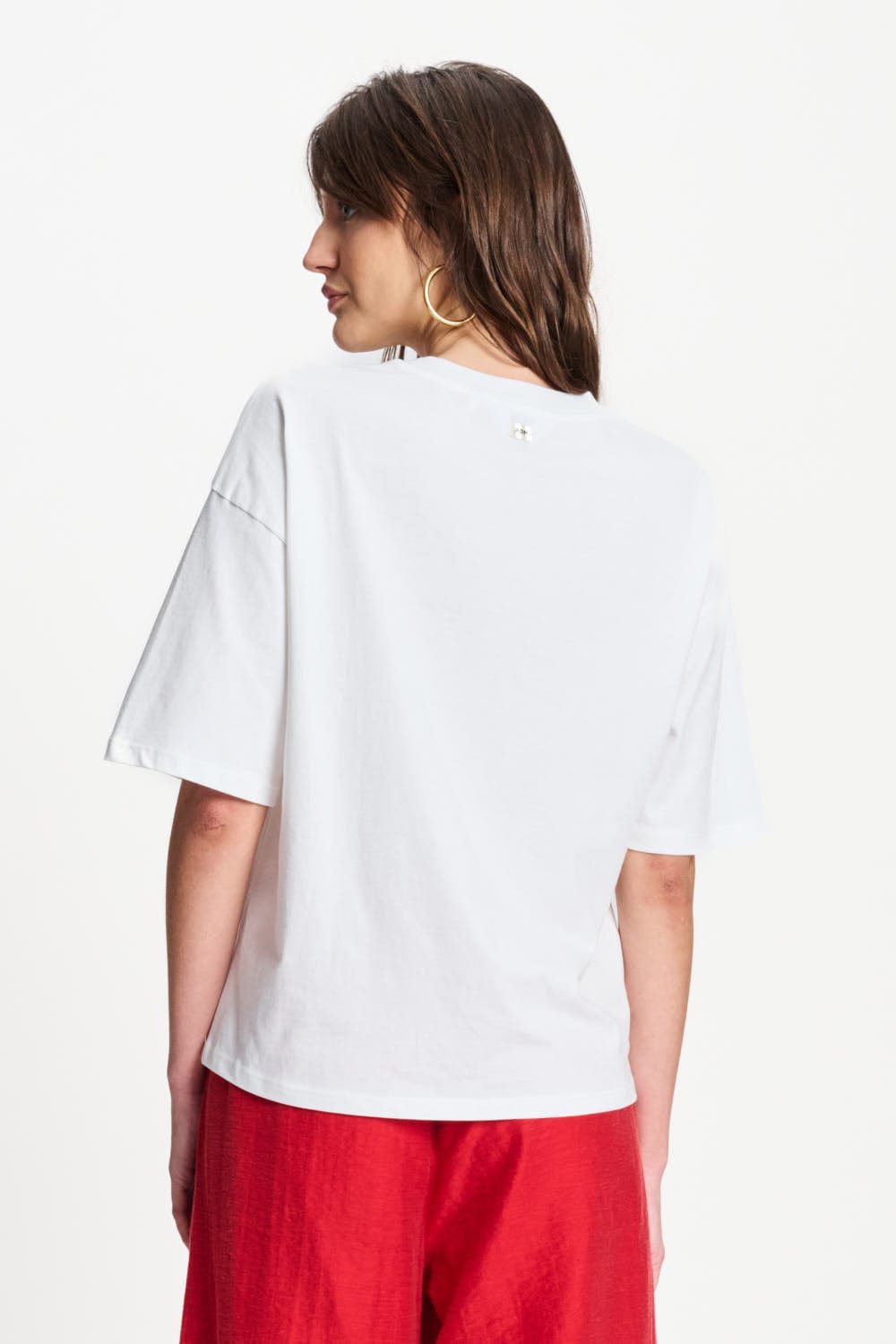 Coupe : Le T-shirt a une coupe boxy avec des manches courtes. Le mannequin sur la photo mesure 178 cm et porte une taille 36.