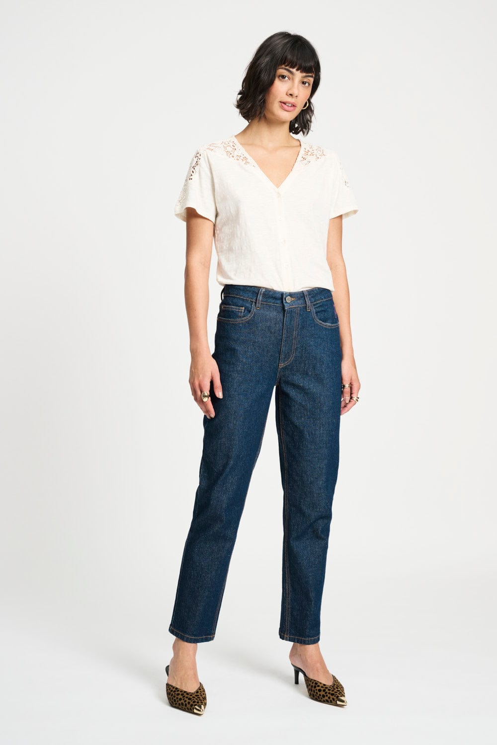 Le t-shirt a une coupe droite. Le mannequin sur la photo mesure 175 cm et porte une taille 36..